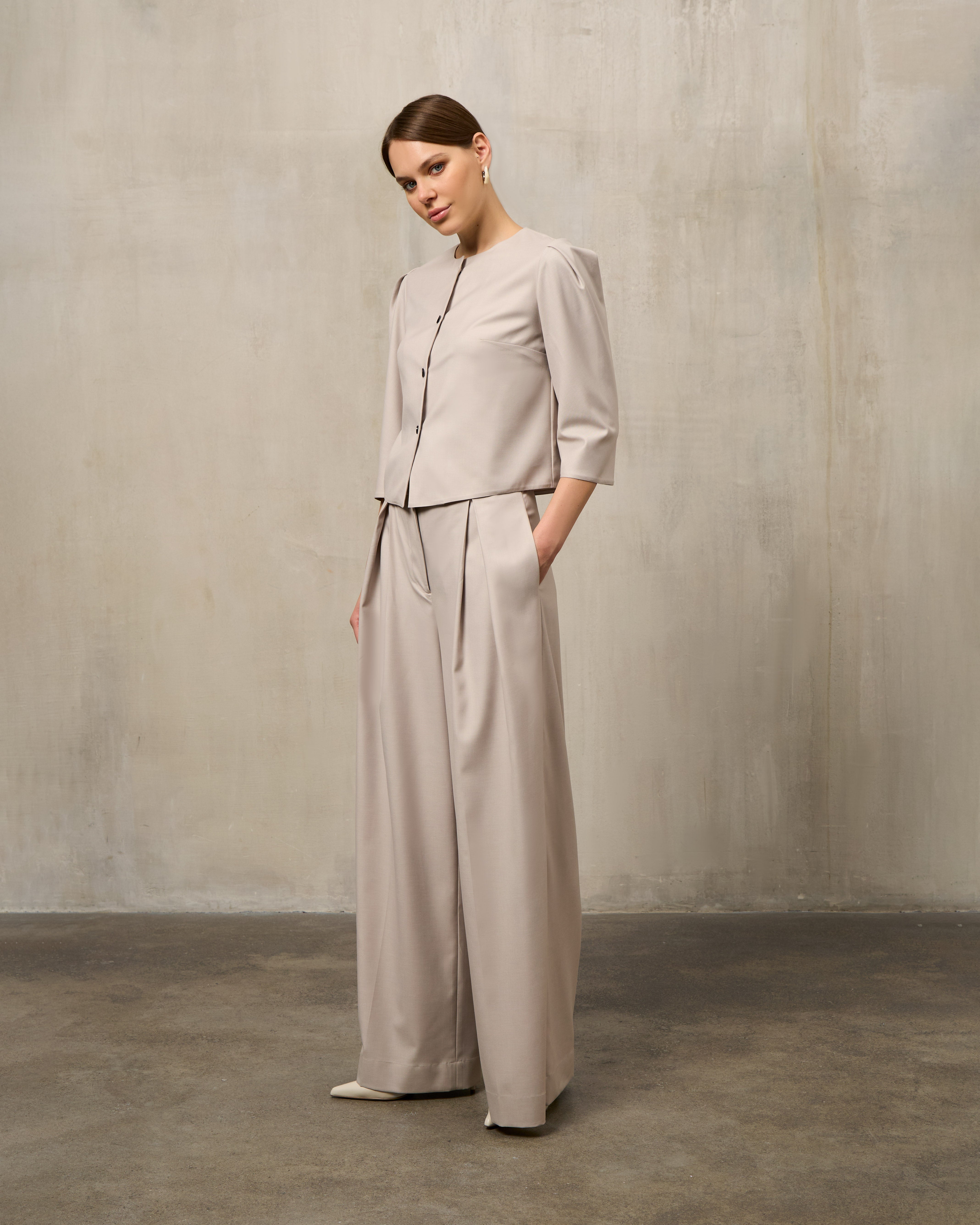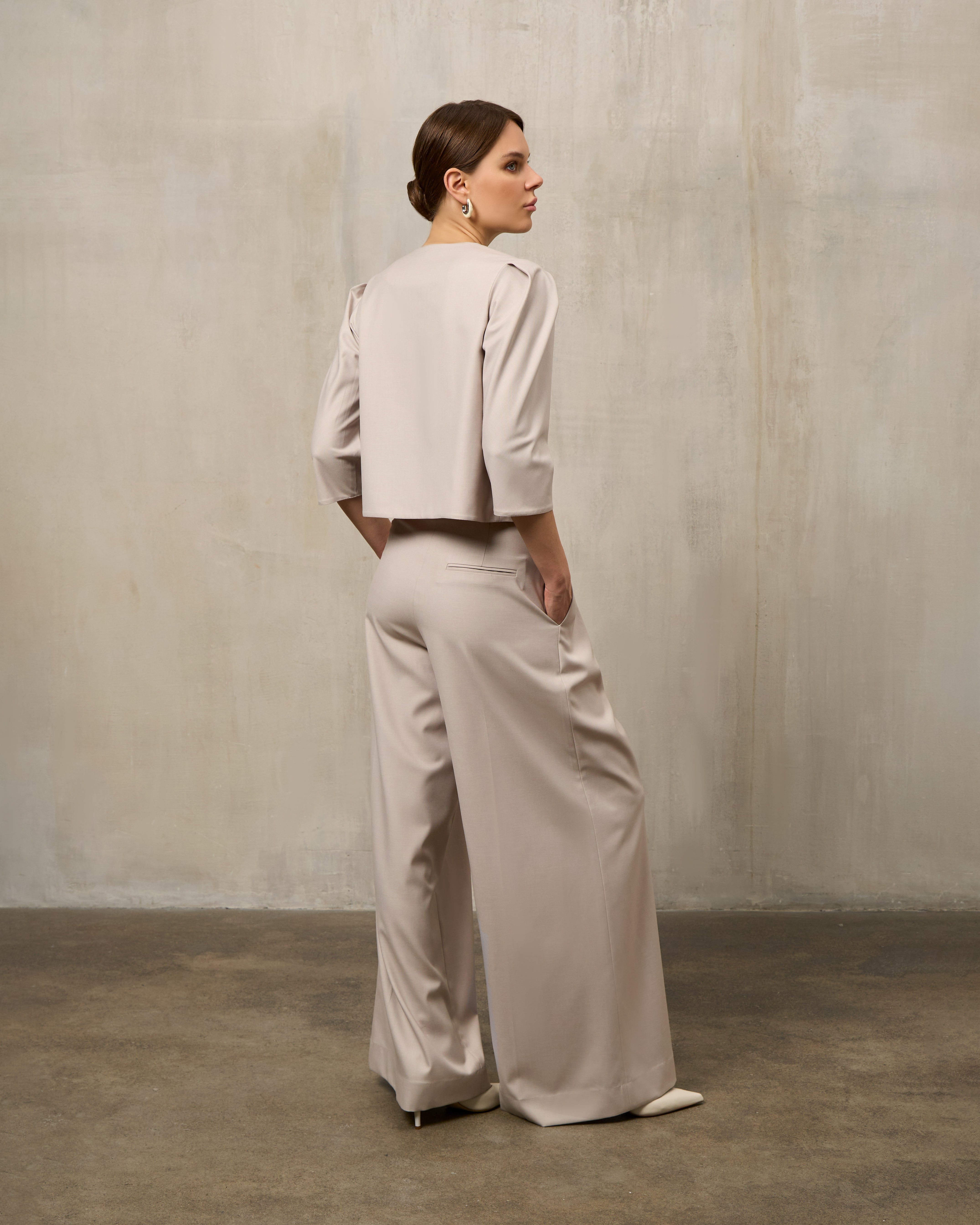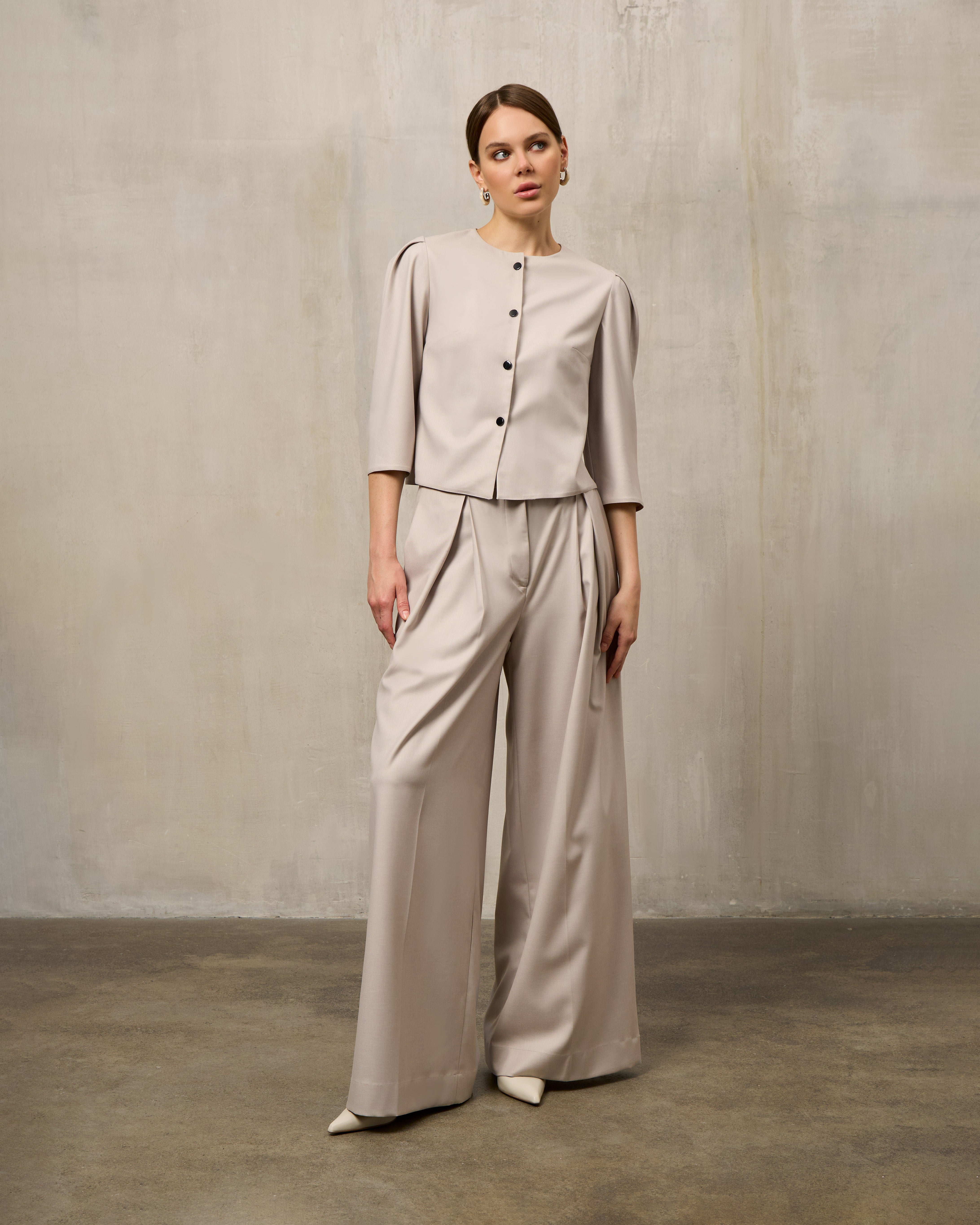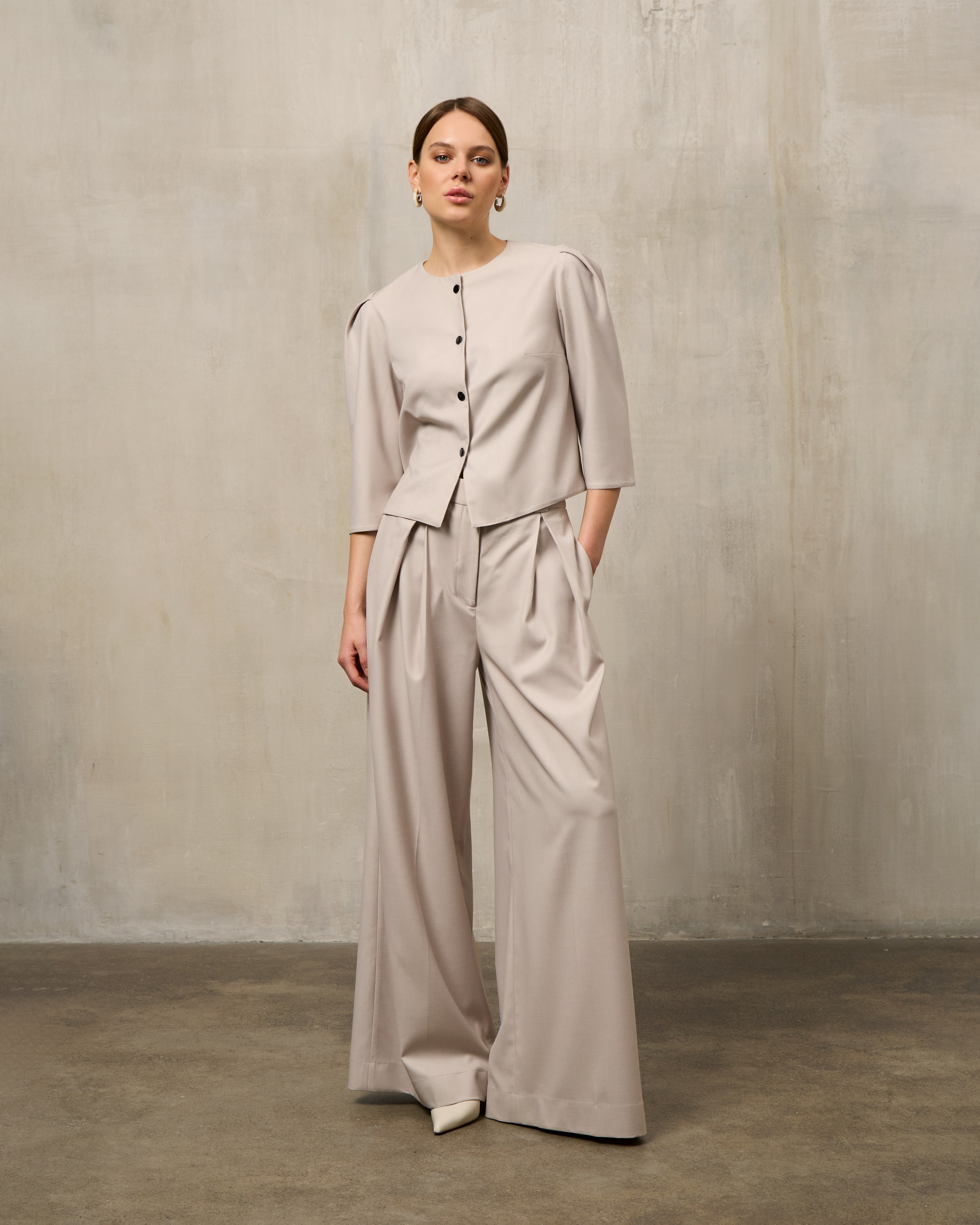 The jacket features a tailored cut that combines elegance and comfort. Its versatile design makes it easy to wear for different occasions, from work to evening events. The palazzo pants go perfectly with the jacket, giving you freedom of movement and a stylish appearance.
