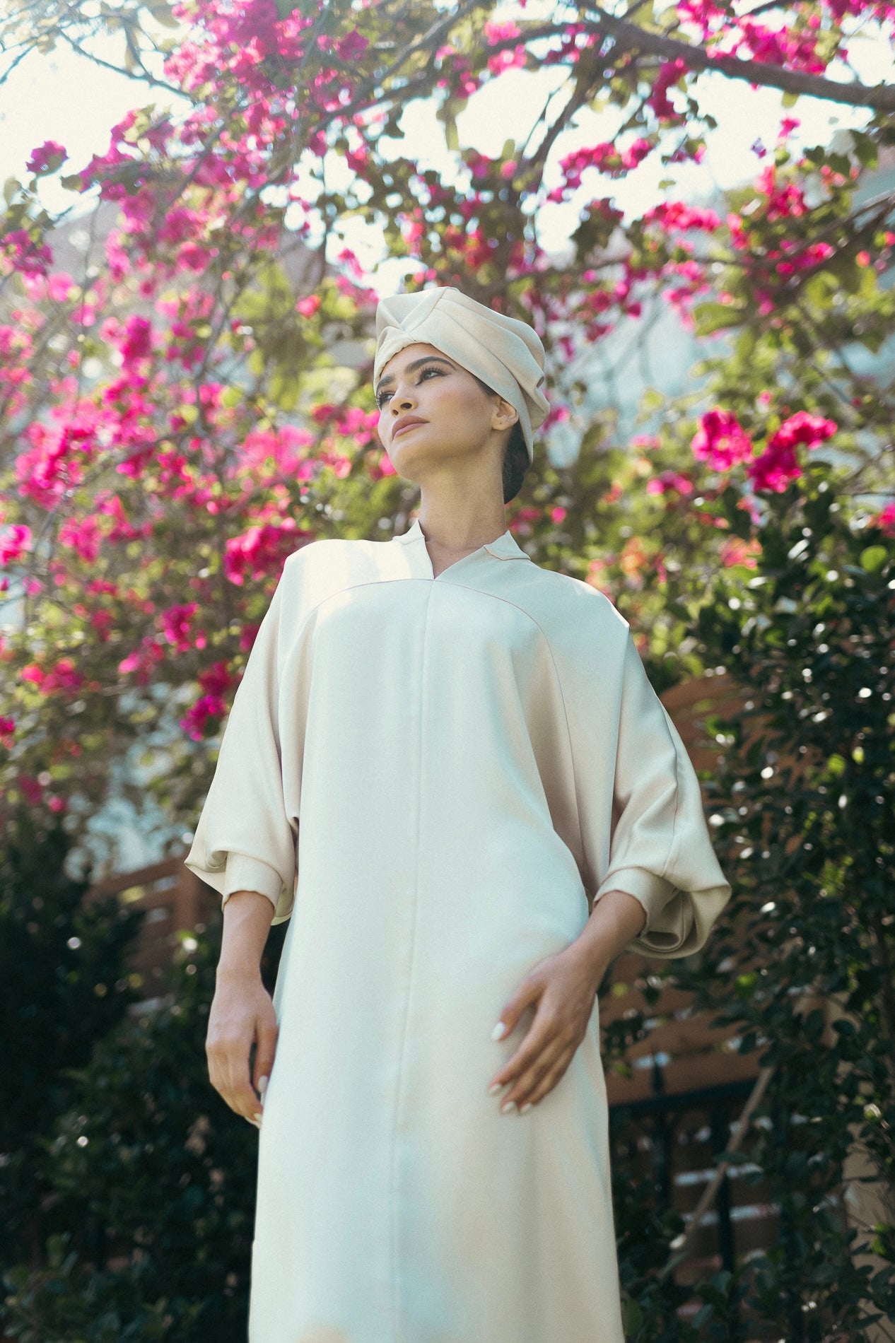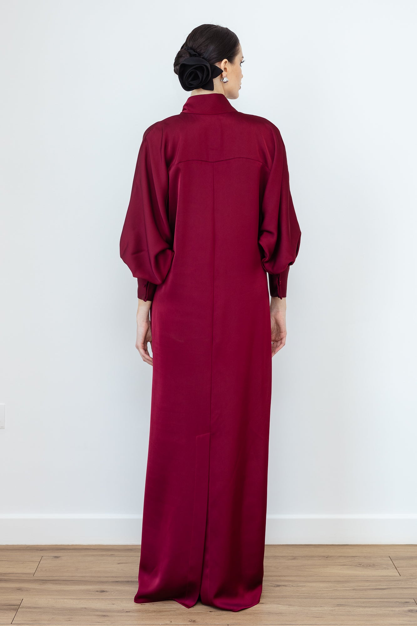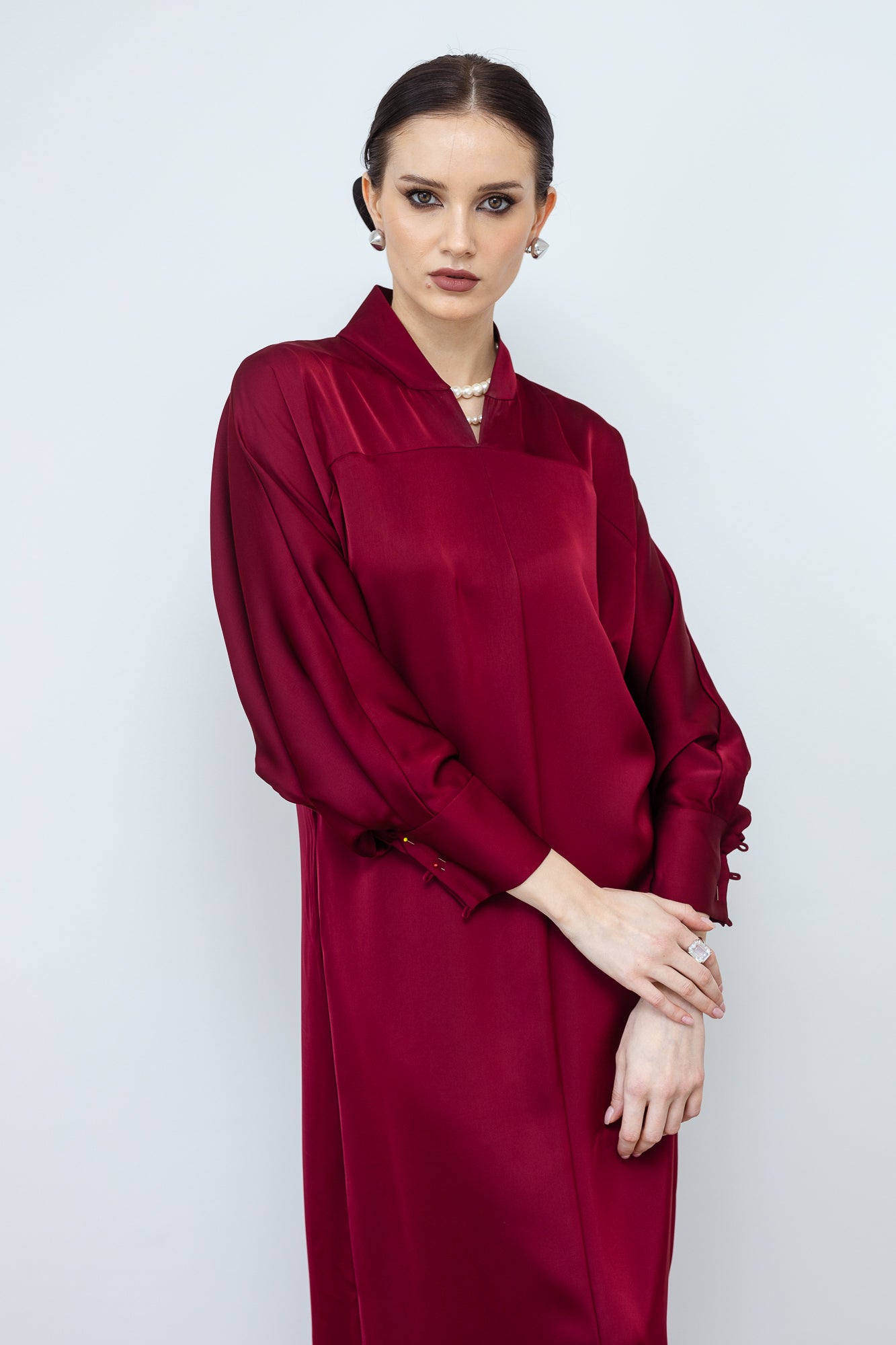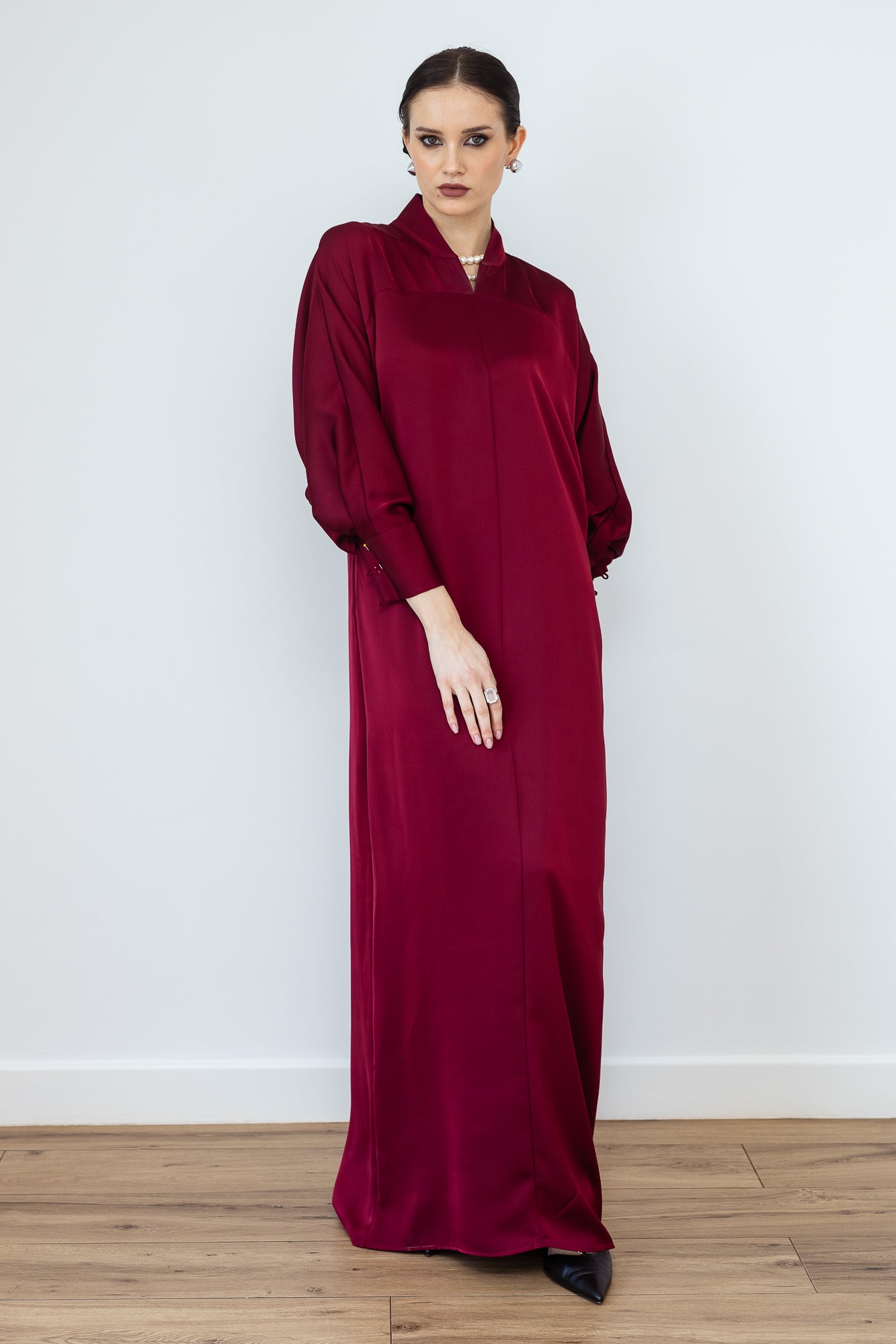 Presented in three shades beige, navy blue, and burgundy this dress is perfect for special moments when you want to feel more magnificent than ever. Each color embodies a unique atmosphere: beige represents the lightness and sophistication of desert sand, navy blue reflects the depth of a starry night sky, and burgundy symbolizes the passion and mystery of Eastern culture.