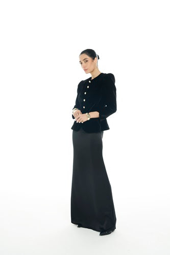 تنورة حريرية سميكة وسترة مخملية بأزرار